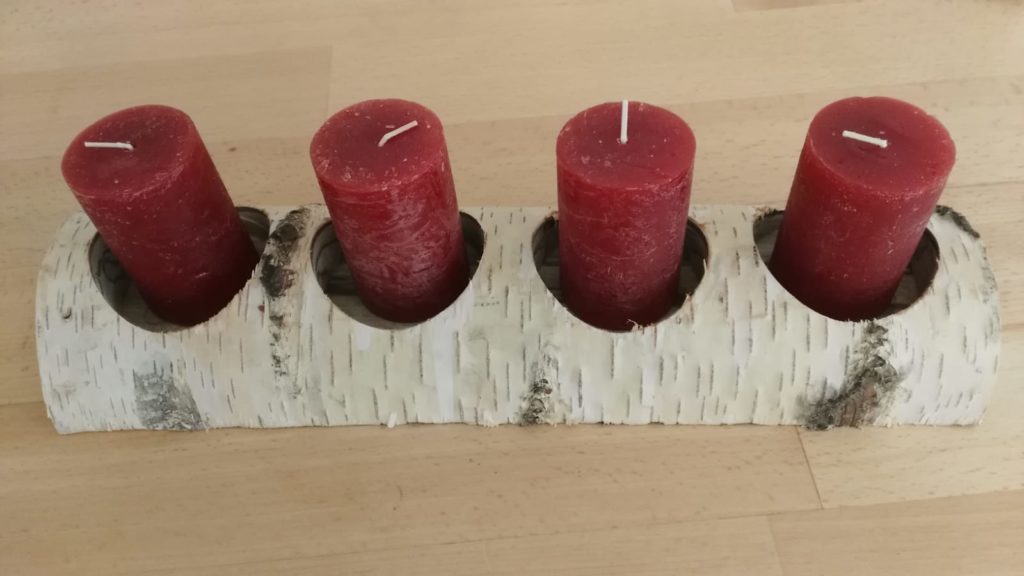 Die Länge eines Kerzenhalter hängt von der Anzahl der Bohrungen. Zwischen den Bohrungen haben wir einen Sicherheitsabstand von ca. 2 cm vorgesehen. Die Breite bzw. die Höhe eines Kerzenhalters hängt vom Umfang des Birkenstammes.
